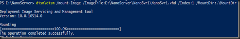 | dism\dism /mount-Image /ImageFile:E:\NanoServer\NanoSvr1\NanoSvr1.vhd /Index:1 /MountDir:.\MountDir |